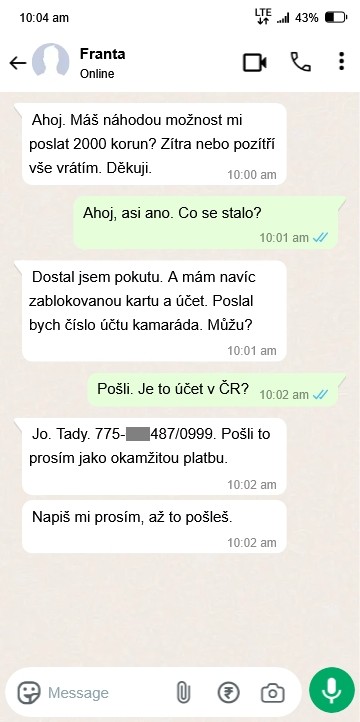Na Váš mobilní telefon Vám v aplikaci WhatsApp přijde od osoby, kterou máte v kontaktech, zpráva. Vaše následná krátká komunikace vypadá následovně: