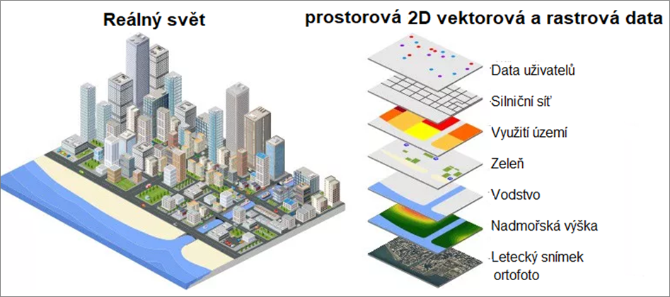 Prostorová data jsou ukládána v databázích v tzv. vrstvách (viz obr. 1). Dle způsobu uložení se vrstvy dělí na vektorové a rastrové. Vektorové vrstvy mohou být bodové (například lavičky v parku), nebo liniové (například elektrické vedení), nebo polygonové (například parcely). Příkladem rastrových vrstev mohou být letecké měřické snímky, respektive ortofota vzniklá na jejich podkladě, družicové snímky, teplotní mapy, hlukové mapy, mapy povrchu, aj. Každá vektorová vrstva uchovává nejen informace o poloze, ale také popisné (atributové údaje). Nejen že lze proto vidět, kde daný vodní tok teče, ale jsou zde i informace o jeho názvu, délce, maximálním průtoku, …